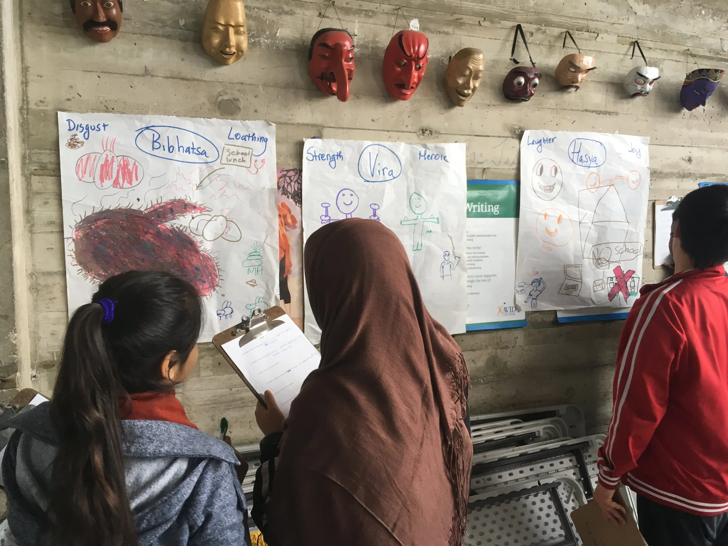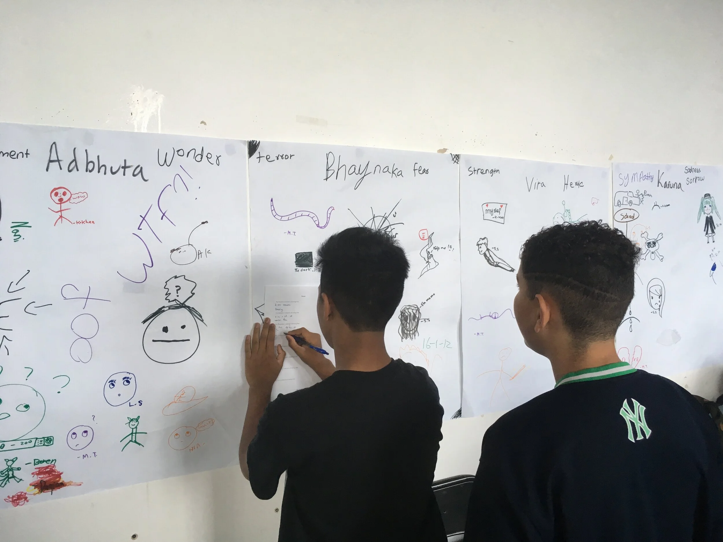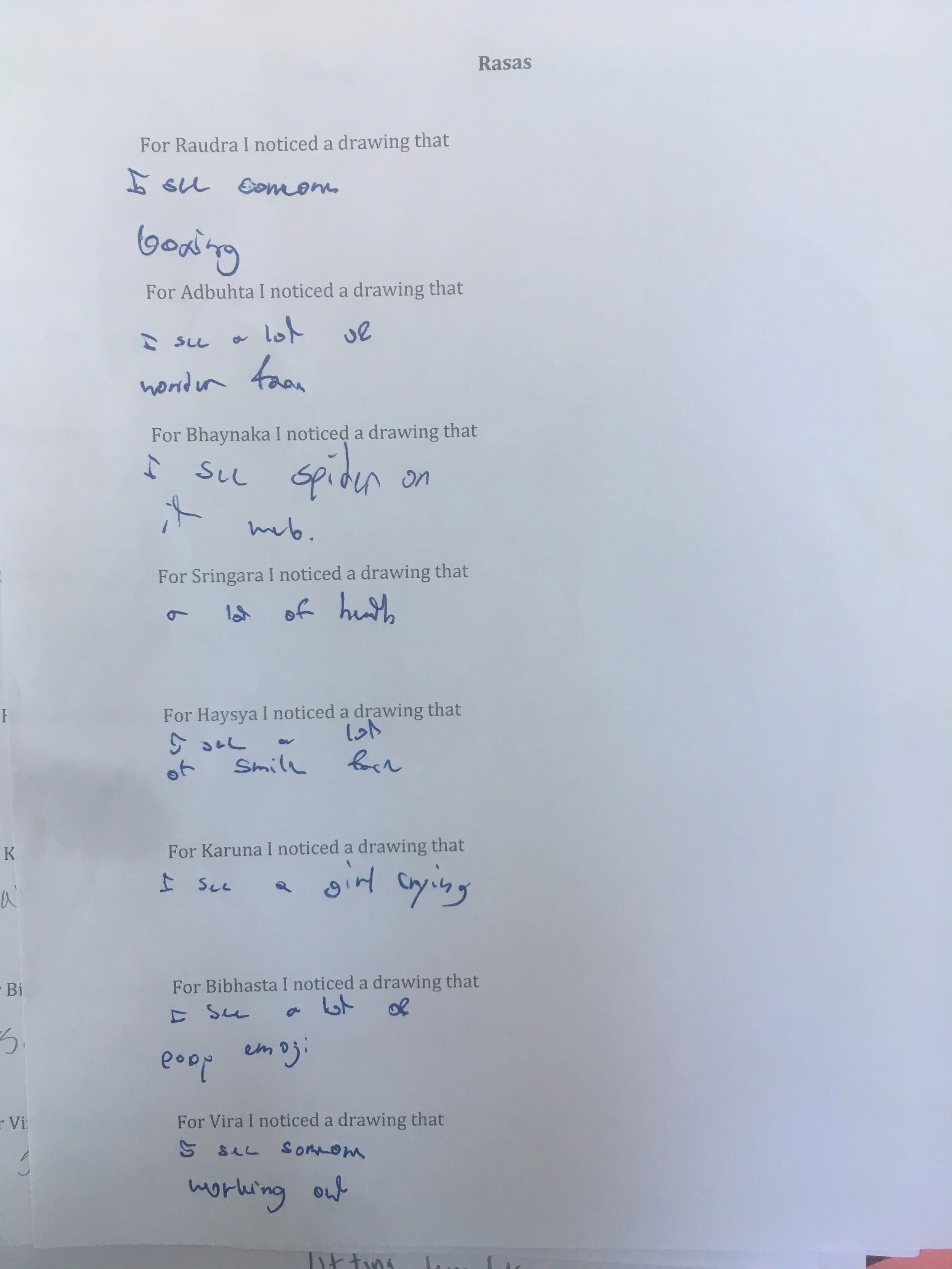 After the first session with rasa boxes is over, (click on the following link if you haven’t seen it yet: https://www.richardsilberg.com/rasa-boxes-introduction)and students have had an opportunity to explore each of the rasas and draw or write their associations, we do a gallery walk. It is usually the next day. I hang the poster papers up around the room and provide each student with a worksheet. In this case the worksheet was open-ended: students were to write down something they noticed. In other iterations I have made it more structured, again it depends on ones language goals. As a teacher you can create a worksheet that will allow your students to practice various language structures that you want them to review or practice. I tend toward an open-ended viewing where students are able to walk to any of the posters and linger or move quickly. However, I do encourage them to speak to each other as much as possible while they “wander”. There are so many rich language interactions and opportunities in this process. At the end we gather around a circle, or return to our desks, and have a structured conversation. I also have had students use various structured language practice strategies to enable them to formally share their observations with others. Again, it all depends on your language objectives.